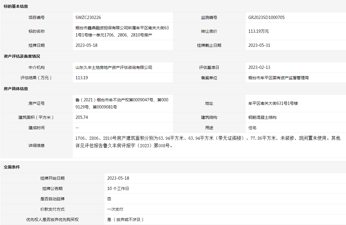 煙臺市鑫鼎融資擔(dān)保有限公司所屬牟平區(qū)南關(guān)大街631號1號樓一單元1706、2806、2810號房產(chǎn)